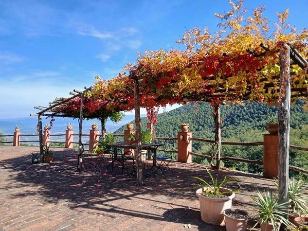 On the terrace, there is also the evocative wooden pergola covered with a vine, the setting for summer lunches and dinners in front of the spectacular panorama. Also present are an outdoor kitchen, with a laundry room and shower, a barbecue, and a wood-fired oven.